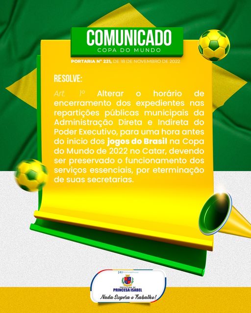 Lembrando que hoje (05) o expediente nas repartições públicas municipais da administração direta e indireta do Poder Executivo encerra às 15h, em razão do jogo da seleção Brasileira na Copa do Mundo do Catar.
