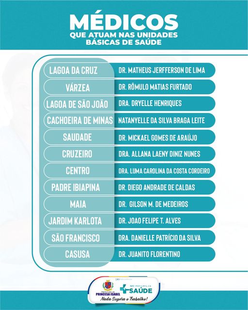 Estamos com 100% de cobertura médica nas nossas Unidades Básicas de Saúde. Confira os profissionais médicos que atuam em cada uma delas!