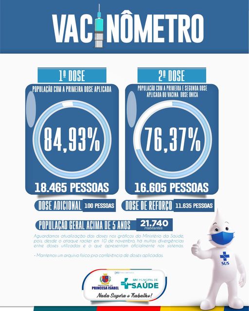 Estamos com mais de 80% da população a partir de 5 anos de idade vacinada, com pelo menos uma dose, contra a COVID-19, e mais de 70% com o esquema vacinal completo. Além disso, 100 pessoas já tomaram a dose adicional e 11.635 a dose de reforço.