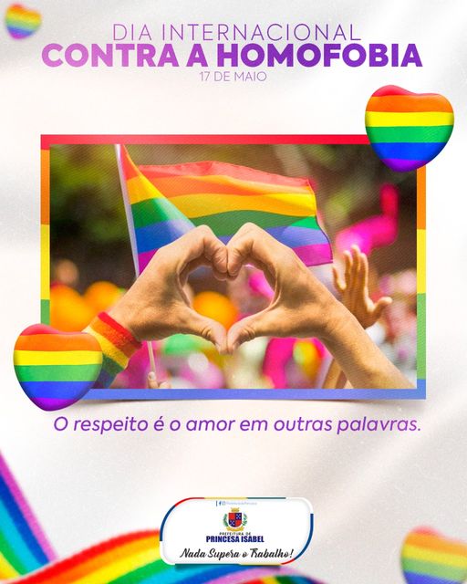 A Prefeitura de Princesa Isabel, através da Secretaria de Assistência Social e a Diretoria da Mulher e de Promoção a Cidadania LGBTQIAP+, reforçam a importância do “Dia Internacional de Luta Contra a Homofobia, Transfobia e Bifobia”, data que visa conscientizar a população em geral sobre a luta contra a discriminação dos homossexuais, transexuais e transgêneros.