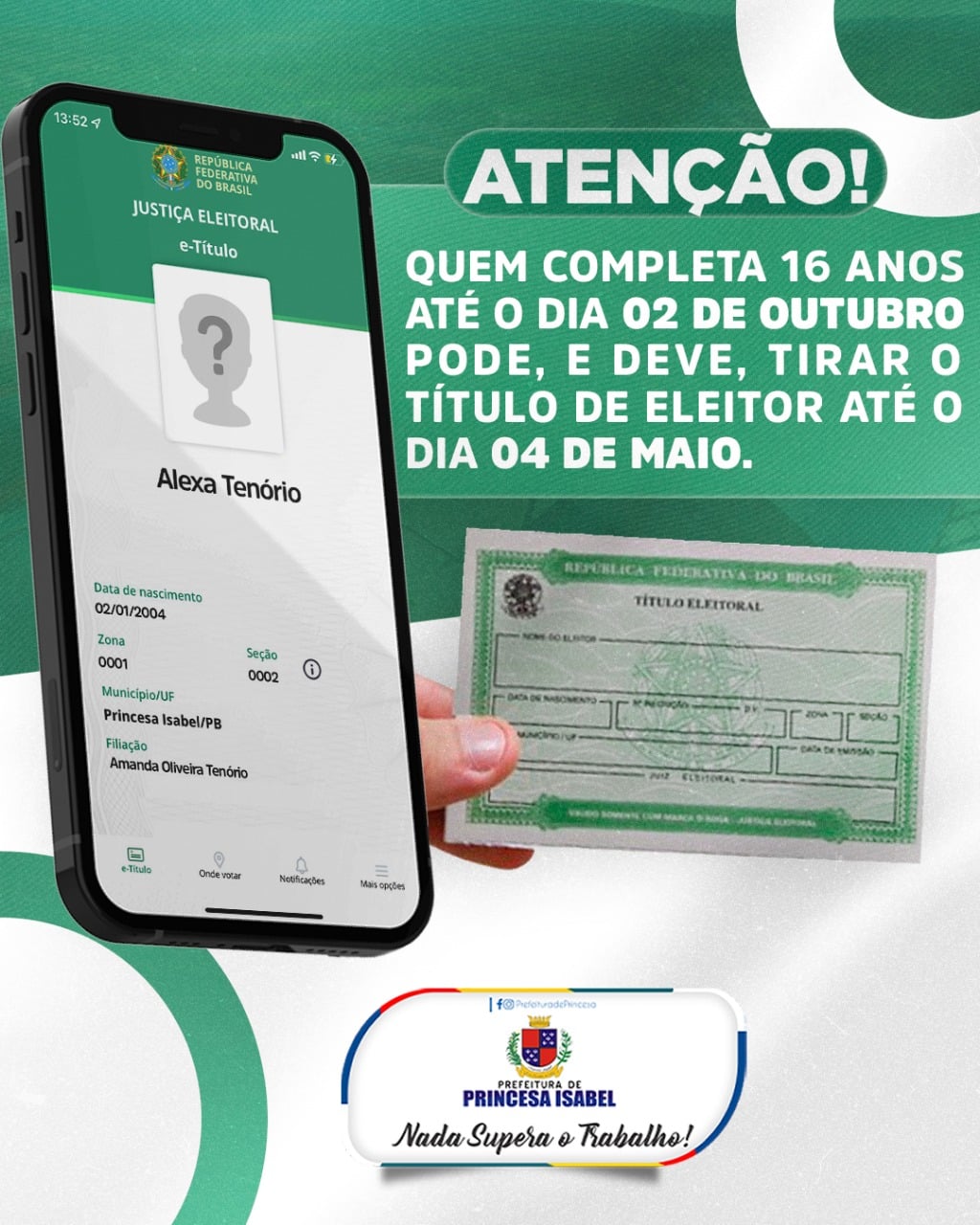 QUEM COMPLETA 16 ANOS ATÉ O DIA 02 DE OUTUBRO PODE E DEVE TIRAR O TITULO DE ELEITOR ATÉ 4 DE MAIO
