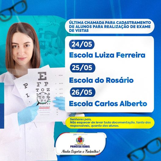 Última chamada para a realização do exame de vista. O horário é das 8h as 11h.