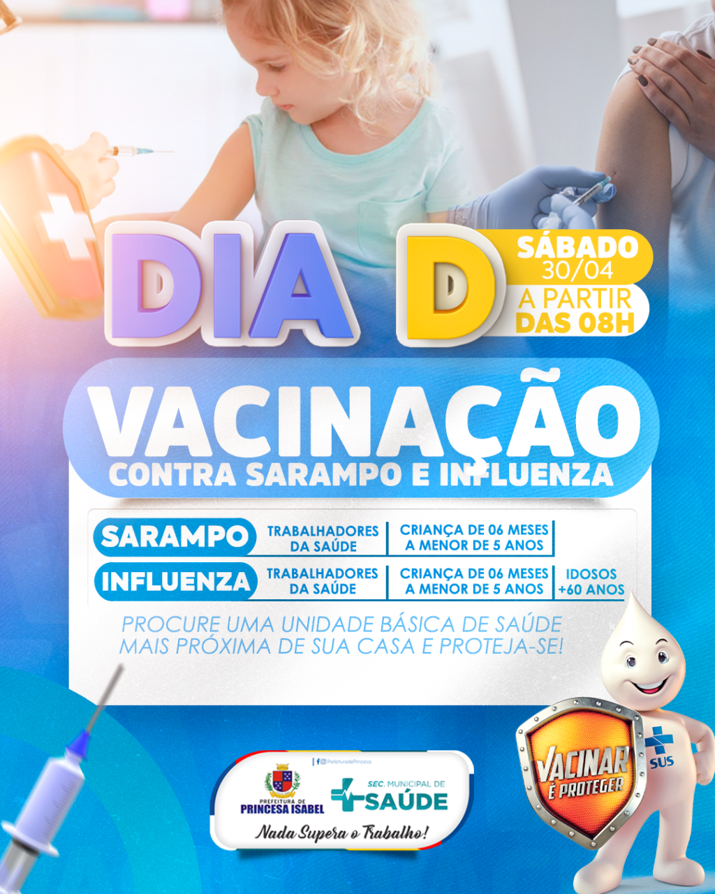 Atenção trabalhadores da saúde, pessoas com 60 anos ou mais e pais e/ou responsáveis de crianças de 06 meses a menores de 5 anos! Neste sábado (30) acontecerá o grande dia D de vacinação contra a Influenza (gripe) e o Sarampo.