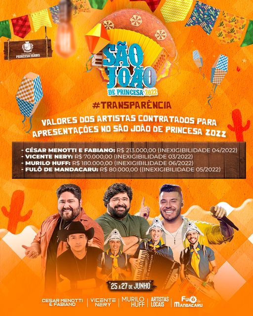 Em cumprimento a Recomendação Conjunta Nº 02/2020 a todos os municípios paraibanos, pelos Ministério Público do Estado da Paraíba (MPPB), Fórum Paraibano de Combate à Corrupção (FOCCO -PB), Ministério Público do Trabalho (MPT/PB) e Ministério Público de Constas do Estado da Paraíba (MPC/PB), a Prefeitura de Princesa Isabel – PB, vem divulgar os valores dos artistas contratados para apresentações nas festividades juninas denominada “São João de Princesa 2022”, nos dias 25, 26, e 27 de junho.