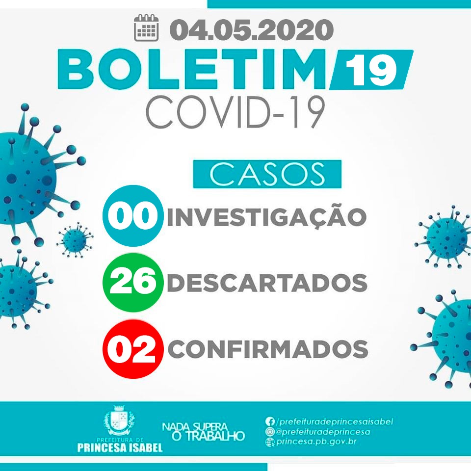 O Comitê Gestor da Crise COVID-19, em Princesa Isabel informa: 1. Até o momento, foram atendidos no Hospital Regional Deputado José Pereira Lima, UPA 24h e na Rede de Atenção Básica, vinte e nove casos suspeitos de infecção por COVID-19 (Coronavírus); dos 29 casos suspeitos, 27 foram descartados e 02 confirmados. 2. Reiteramos que todas as medidas utilizadas para atestar como casos suspeitos e casos descartados, seguem rigorosamente o que preconiza o Ministério da Saúde; 3. As determinações do Ministério da Saúde para achatar a curva epidemiológica da disseminação da CODIV-19 continuam massificadas; 4. Segundo a Organização Mundial da Saúde e o Ministério da Saúde, o isolamento social é a mais importante medida de contenção da disseminação do Coronavírus; só saia de casa em situação de extrema necessidade. 5. As determinações contidas no Decreto Municipal 07 de 21 de março de 2020 DEVEM ser cumpridas; sua desobediência está sujeita ao uso da força policial e medidas judiciais. 6. O uso de máscaras é obrigatório em todo o município de Princesa Isabel, conforme decreto editado e publicado na íntegra na página oficial do governo municipal e redes sociais da prefeitura. Princesa Isabel, 04 de maio de 2020.