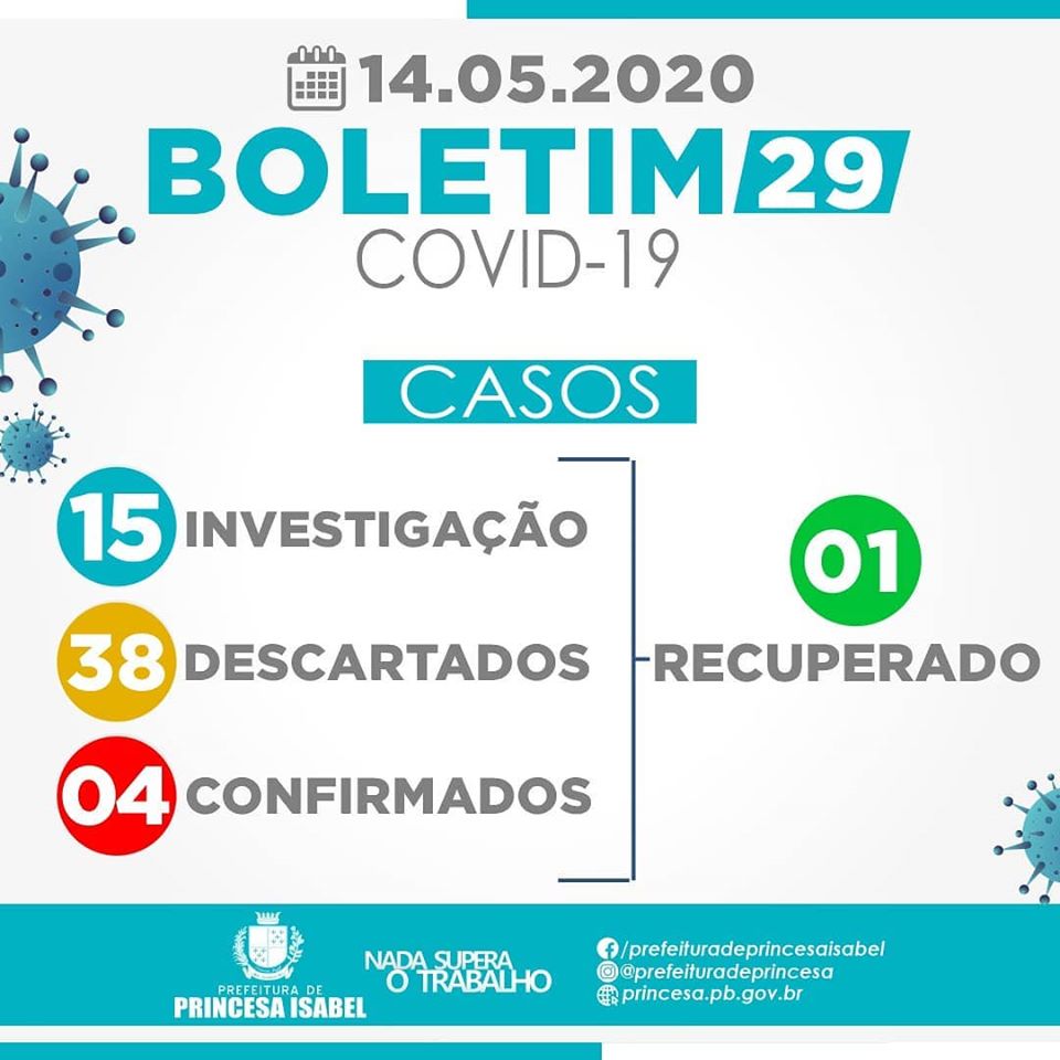 O Comitê Gestor da Crise COVID-19, em Princesa Isabel informa: 1. Até o momento foram atendidos no Hospital Regional Deputado José Pereira Lima, UPA 24h e na Rede de Atenção Básica 57 casos suspeitos de infecção por COVID-19 (Coronavírus); desses, 38 foram descartados, 4 confirmados,15 estão em investigação. Dos confirmados, 1 foi recuperado. Já foram notificadas e assinaram o Termo de Compromisso da Quarentena nas Barreiras Sanitárias 496 pessoas vindas de outras regiões do país, das quais 331 já cumpriram o isolamento e 165 seguem no período de cumprimento. 2. Reiteramos que todas as medidas utilizadas para atestar como casos suspeitos e casos descartados, seguem rigorosamente o que preconiza o Ministério da Saúde; 3. As determinações do Ministério da Saúde para achatar a curva epidemiológica da disseminação da CODIV-19 continuam massificadas; 4. Segundo a Organização Mundial da Saúde e o Ministério da Saúde, o isolamento social é a mais importante medida de contenção da disseminação do Coronavírus; só saia de casa em situação de extrema necessidade. 5. As determinações contidas no Decreto Municipal 07 de 21 de março de 2020 DEVEM ser cumpridas; sua desobediência está sujeita ao uso da força policial e medidas judiciais. 6. O uso de máscaras é obrigatório em todo o município de Princesa Isabel, conforme decreto editado e publicado na íntegra na página oficial do governo municipal e redes sociais da prefeitura. Princesa Isabel, 14 de maio de 2020.