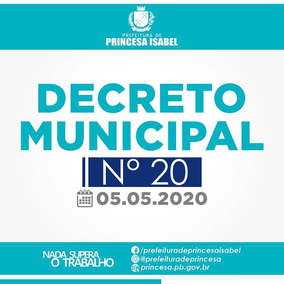 A Prefeitura de Princesa Isabel editou nesta terça-feira (05) mais um decreto com medidas de combate a disseminação do Coronavírus. O Decreto Nº 20/2020 traz a proibição do comércio ambulante (porta a porta) e de sacoleiras em todo o município, estende a suspensão de atendimento ao público nas repartições públicas municipais até o dia 03 de junho (exceto o atendimento presencial indispensável) e endurece a obrigatoriedade da quarentena por parte das pessoas que estão chegando ao município.